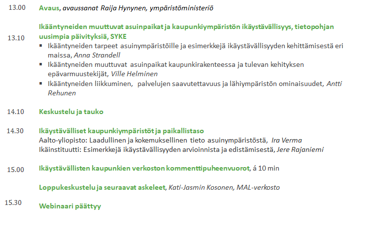 - Asuinympäristöjen ikäystävällisyys seudun eri osissa, Antti Rehunen ja Maija Tiitu (20 min.)