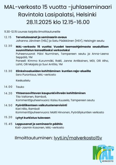 Valtakunnallinen maankäytön, asumisen ja liikenteen kehittämisverkosto eli MAL-verkosto täyttää 15 vuotta! Perinteinen vuosittainen tulosseminaari muuntuu tänä syksynä 15-vuotisjuhlaseminaariksi. Tule kuulemaan miten KOKO-ohjelman verkostosta muodostui pitkäikäinen valtakunnallinen MAL-asioiden yhteistyöfoorumi ja mitä on luvassa jatkossa. Seminaarissa käydään läpi tuttuun tapaan myös kuluvan vuoden hankkeet ja niiden keskeiset suositukset.